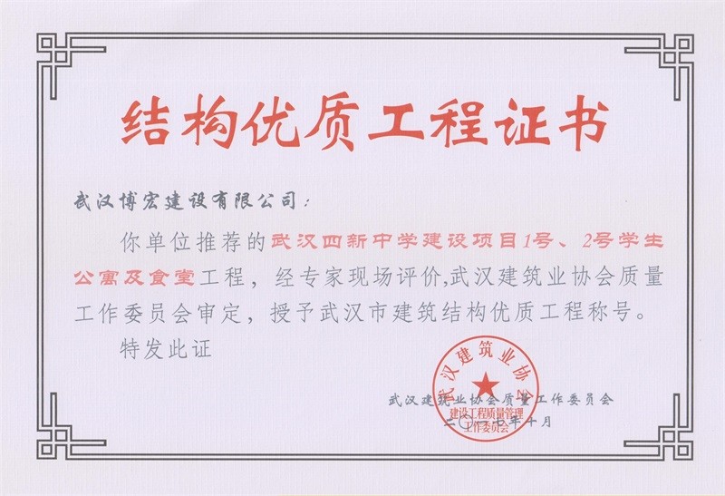 結(jié)構(gòu)優(yōu)質(zhì)工程證書(武漢四新中學綜合1號、2號學生公寓及食堂樓)