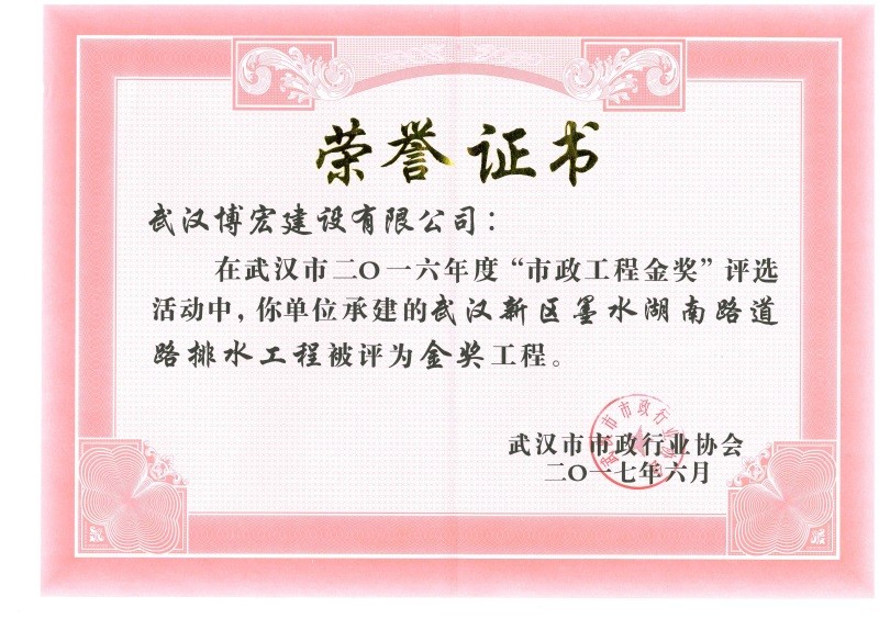 2016年度市政工程金獎(墨水湖南路道路排水工程)