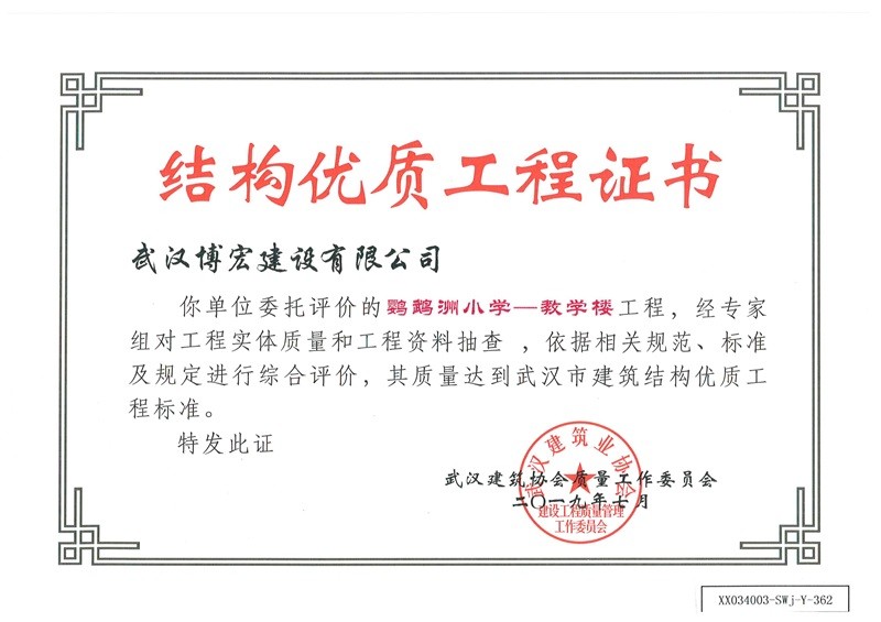 結(jié)構(gòu)優(yōu)質(zhì)工程證書(鸚鵡洲小學(xué)教學(xué)樓)