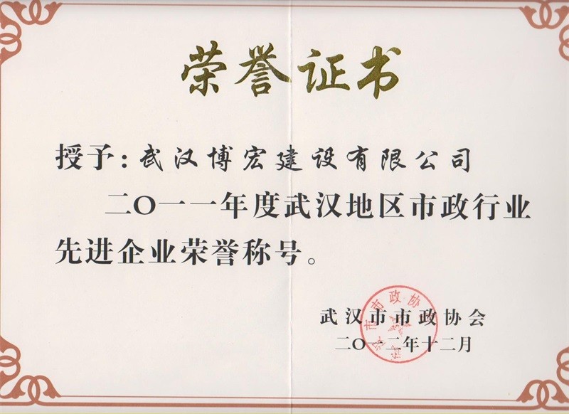 2011年度武漢地區(qū)市政行業(yè)先進企業(yè)榮譽稱號