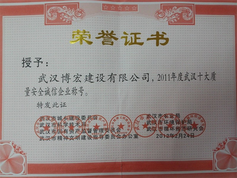 2011年度武漢十大質量安全誠信企業(yè)稱號