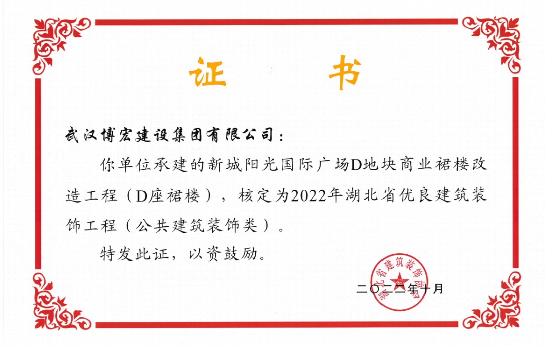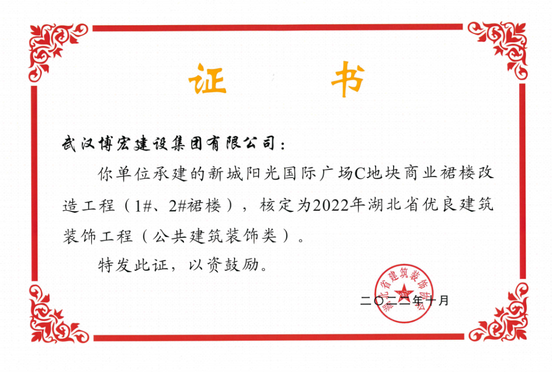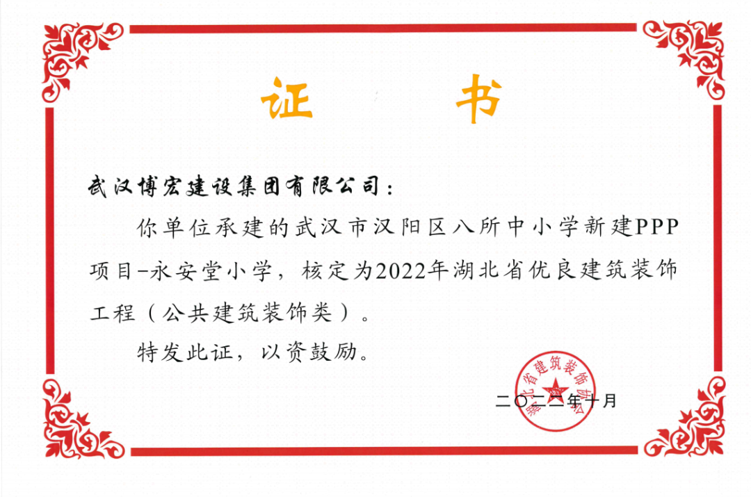 近日,湖北省建筑裝飾協(xié)會(huì)發(fā)布了《關(guān)于開展2022年湖北省建筑裝飾工程質(zhì)量目標(biāo)考核工作的通知》,由博宏建設(shè)集團(tuán)承建的華發(fā)四季等5所幼兒園裝修工程(EPC)、新城陽光國(guó)際廣場(chǎng)C地塊商業(yè)裙樓改造工程(1#、2#裙樓)、新城陽光國(guó)際廣場(chǎng)D地塊商業(yè)裙樓改造工程(D座裙樓)、武漢市漢陽區(qū)八所中小學(xué)新建PPP項(xiàng)目-永安堂小學(xué)被核定為“2022年湖北省優(yōu)良建筑裝飾工程(公共建筑裝飾類)”。