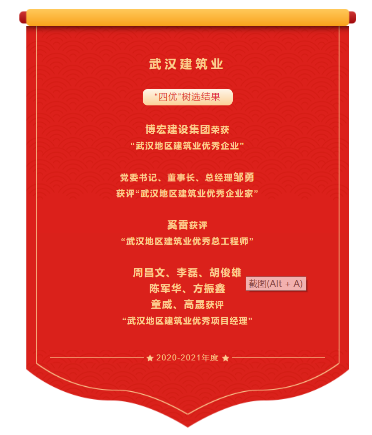 ? ? ? ? 近日,武漢建筑業(yè)協(xié)會發(fā)布2020-2021年度武漢地區(qū)建筑業(yè)優(yōu)秀企業(yè)、優(yōu)秀企業(yè)家、優(yōu)秀總工程師、優(yōu)秀項(xiàng)目經(jīng)理(以下稱為“四優(yōu)”)選樹結(jié)果。經(jīng)會員單位自主申報(bào)、協(xié)會組織專家評審、主管部門復(fù)核、武漢建協(xié)三季度會長辦公會審議通過并在協(xié)會網(wǎng)站進(jìn)行公示,“四優(yōu)”選樹結(jié)果名單火熱出爐。博宏建設(shè)集團(tuán)榮獲“武漢地區(qū)建筑業(yè)優(yōu)秀企業(yè)”;黨委書記、董事長、總經(jīng)理鄒勇獲評“武漢地區(qū)建筑業(yè)優(yōu)秀企業(yè)家”;奚雷獲評“武漢地區(qū)建筑業(yè)優(yōu)秀總工程師”;周昌文、李磊、胡俊雄、陳軍華、方振鑫、童威及高晟獲評“武漢地區(qū)建筑業(yè)優(yōu)秀項(xiàng)目經(jīng)理”。