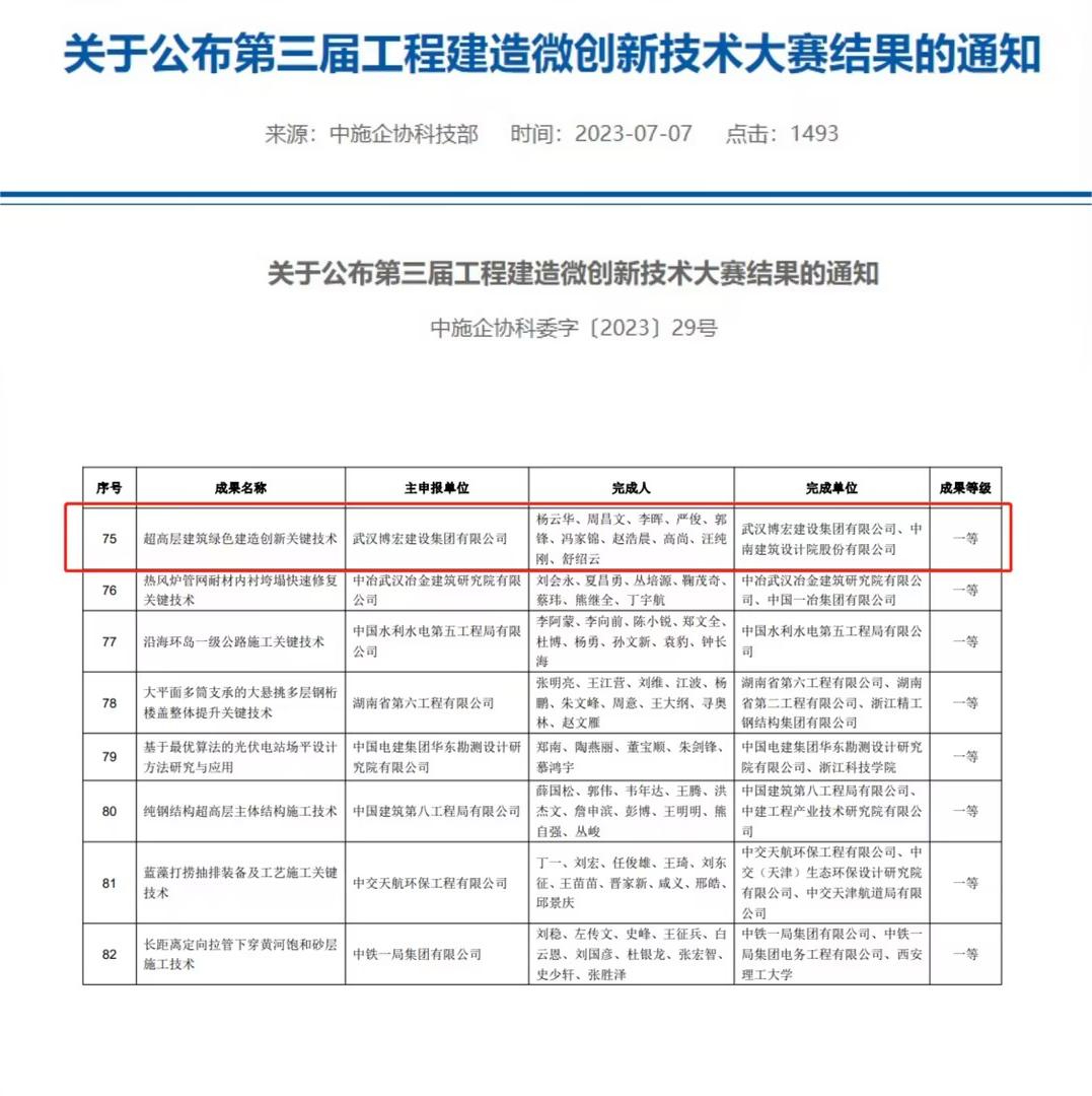 近日,中國(guó)施工企業(yè)管理協(xié)會(huì)公布第三屆工程建造微創(chuàng)新技術(shù)大賽獲獎(jiǎng)結(jié)果。以中南科研設(shè)計(jì)中心建設(shè)項(xiàng)目為背景的“超高層建筑綠色建造創(chuàng)新關(guān)鍵技術(shù)”榮獲中施企協(xié)第三屆工程建造微創(chuàng)新技術(shù)大賽一等成果,這也是博宏建設(shè)集團(tuán)首次獲得該類賽事一等獎(jiǎng)。